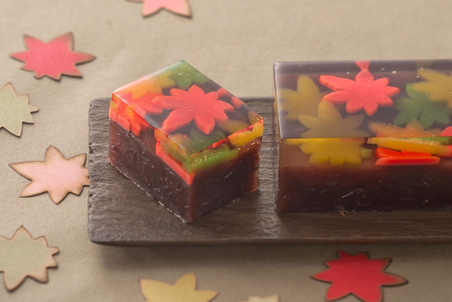 秋の陽を透かして色鮮やかに輝くかえでの葉を羊羹であらわし、丁寧に炊き上げた風味豊かな小倉羹(おぐらかん)と透き通る琥珀羹(こはくかん)の二層羊羹にとじこめ、奥行きある紅葉の情景を表現しました。