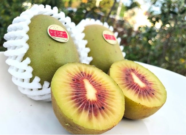 「レインボーレッド」は静岡県で生まれた品種で、果肉の一部が赤色をしており、毛がなくツルツルとしています。糖度が非常に高く、キウイフルーツ独特の酸味が少なく甘味を強く感じることができるため、大変人気となっています。