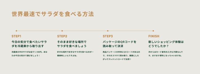 CRISP STATIONは、レジ会計のない全く新しいショッピング体験を提供するサラダストアです。サラダはどれも同じ価格なので、今日の気分で好きなサラダを選んだら冷蔵庫から手にとって出ていくだけ。好きな場所でワクワクしながら食べたあとはパッケージのQRコードからワンタップで決済。あなたの大切な時間を少しでも長くサラダを楽しむために使って欲しい、そう考えたらレジ会計がなくなりました。