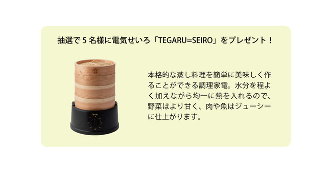 | 参加方法 | 1.「TEGARU=SEIRO」を使った料理の写真を撮影(料理は食材をせいろに並べて蒸すだけでもOK) 2.「#せいろ生活」「#電気せいろ」をつけて、ご自身のインスタグラムアカウントに写真を投稿 |