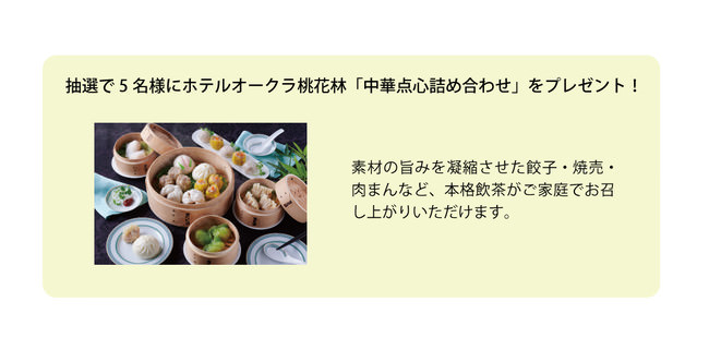 | 賞品 | ホテルオークラ桃花林「中華点心詰め合わせ」 メーカー価格:5,400円(税込) ■ホテルオークラ公式:https://theokuratokyo.jp |