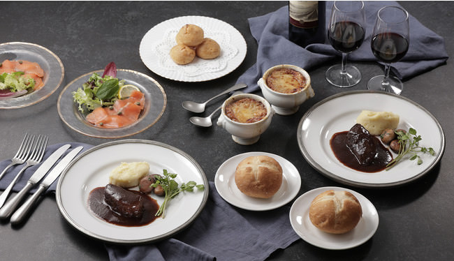 食前のおつまみ・グジェールに始まり、クルトンやチーズをのせて焼き上げるオニオングラタンスープ、黒毛和牛の赤ワイン煮などを詰め合わせたコース仕立てのフレンチディナーセットです。ワインを片手に、大切な人とゆったり贅沢なひと時をお過ごしください。