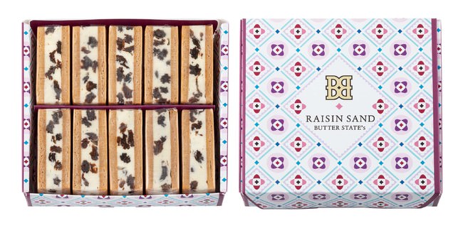 今年4月にオープンしたバタースイーツ専⾨店「BUTTER STATE’s」。代表作であるクッキー『バターステイツ』シリーズは、オープン1ヶ月で累計販売30万個を突破しました。そんな大好評のこのブランドから新たなバタースイーツが誕生します。バターのおいしさにとことん向き合うことでたどり着いた、こだわりの「レーズンサンド」が完成しました。