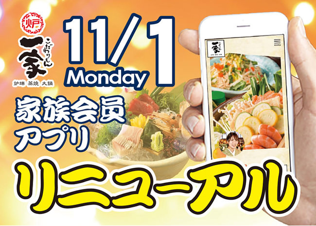株式会社一家ホールディングスの連結子会社である株式会社一家ダイニングプロジェクト(本社:千葉県市川市、代表取締役社長:武長 太郎 以下当社)が運営する“第2の我が家”をコンセプトにした本格和食居酒屋「こだわりもん一家」のスマートフォン会員アプリ『こだわりもん一家公式アプリ』が、2021年11月1日(月)にリニューアルされますのでお知らせいたします。