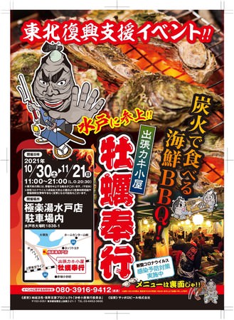 宮城県石巻の牡蠣をセルフ炭火焼き(海鮮BBQ)で楽しむ「出張カキ小屋 牡蠣(かき)奉行」(TEL 080-3916-9412)が10月30日、極楽湯水戸店(水戸市大塚町)駐車場に期間限定オープン。期間は11月21日まで。