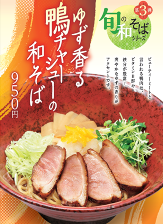 株式会社サガミホールディングスのグループ企業である味の民芸フードサービス株式会社(本社:東京都立川市錦町3-6-6 代表取締役社長 榊原 晃)は、らーめん専門店ぶぶかにて2021年11月1日(月)より、限定メニュー『ゆず香る鴨チャーシューの和そば』の販売をスタートいたします。あっさりしたオシャレな油そばをイメージした『旬の和そば』シリーズの第3弾となります。