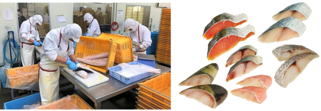 山佐食品は今年4月に創業61年を迎えます。BtoB事業を展開しており、創業から長年培ってきた信頼とブランド力により、学校給食・産業給食・病院など安定的な販売先を有し、常時20種類以上の魚種を取り揃え、切り身のみの仕上げではなく、干物やフライの加工も行っています。山佐食品の強みとして、“手切り”のオペレーションに特化しており、機械での対応が難しいサイズの加工や骨取りを人力で行っています。フルオーダーカットが可能なため、様々なニーズにあった商品の提供、豊富な魚種に対応することができます。創業当時から築き上げてきた幅広いネットワークにより、東海地方を中心に全国の取引様と提携されています。
