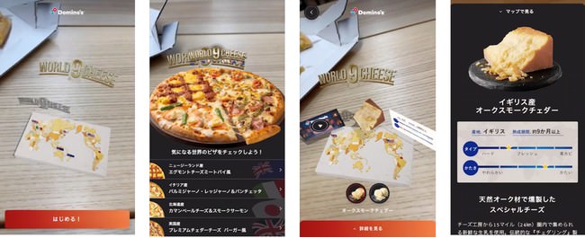それを、チーズを存分に楽しんでいただくために、チーズと相性の良い食材を使用した4つのインターナショナルな味わいに仕上げました。(1)「英国産プレミアムチェダーチーズバーガー風」、(2)「ニュージーランド産エグモントチーズのミートパイ風」、(3)「イタリア産パルミジャーノ・レッジャーノ&パンチェッタ」、(4)「北海道産カマンベール&スモークサーモン」のクワトロピザは、自慢の一品。世界のチーズを一挙に味わえるワクワク感をぜひともお楽しみにください。更に、本日同時リリースされる「チーズの世界をめぐる旅」ARで、9つのチーズの知識や相性のいいドリンクとのペアリング情報もチェックできます。