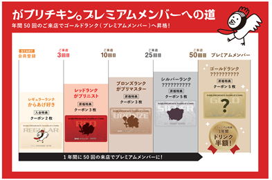 「がブリチキン。」公式アプリは、がブリチキン。の最新情報やお得なクーポンが届くオリジナルアプリです。本アプリにはスタンプ機能が搭載されており、1,000円(税込)以上のご飲食、ご購入で来店スタンプが貯まります。指定の来店回数を達成するとランクアップし、昇格特典としてクーポンが付与されます。ランクごとにお得な特典を受けることができ、最高ランクの“ゴールドランク”(初回来店から1年以内に50回来店達成)になると、がブリチキン。コアファンの証として、”1年間各種ハイボール、ソフトドリンクが半額”となります。