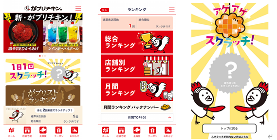 また、誕生日限定クーポンのプレゼントや、全国の「がブリチキン。」ファンと通算来店回数で競い合うランキング機能など、楽しみながらスタンプを貯められるアプリとなっています。