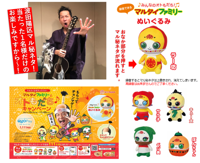 棒ラーメンと長崎皿うどんでおなじみ、株式会社マルタイ(本社:福岡市西区今宿青木)は、日本の食卓を笑顔にするために、「録音できる!マルタイファミリーぬいぐるみ」や「QUOカードPay」などが、合計111名様に当たる「マルタイファミリーとオトもだち キャンペーン」を2021年10月1日(金)から11月30日(火)まで開催します。