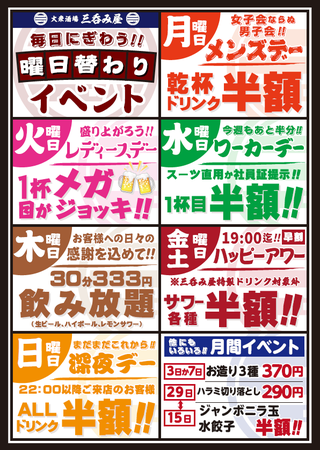 | 月曜日から日曜日まで開催!お得で楽しい毎日通いたくなる【曜日イベント】 |