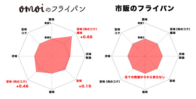 株式会社キューサイ分析研究所にて、一般的なフライパンと「おもいのフライパン」を全く同じ条件で、同じ部位のお肉を焼き、味を数値化して比較分析を行った結果、「肉のコク」がより強く出ていることが証明。スッキリと消える先味から後味まで肉のコクが強く表れ、肉らしさ、肉本来の味を引き出すことができる。
