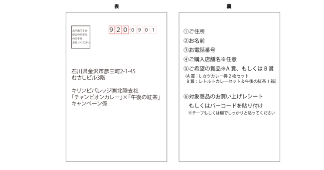 官製はがきに「午後の紅茶」と「チャンピオンカレー商品」の購入がわかるレシートもしくはバーコードを添付し、お名前・ご住所・ご連絡先・希望商品を記載の上投函してください。