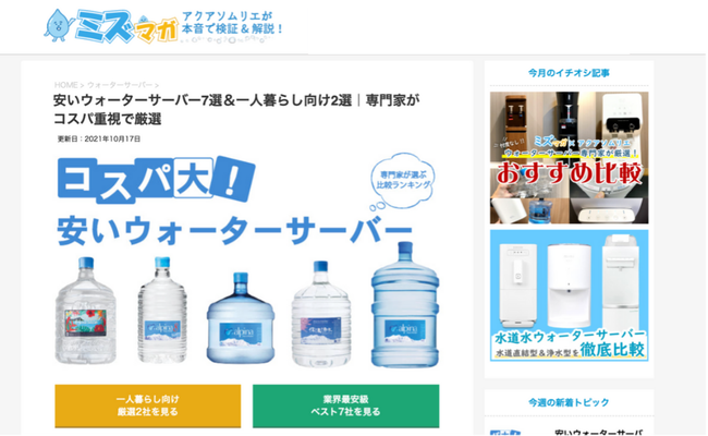 「ミズマガ」は、ウォーターサーバーの比較や飲料水に関するライフハックなどを紹介する情報メディアです。ファミリー層をはじめ一人暮らしやダイエット中の方など、アクアソムリエ監修によるさまざまな生活シーンに合わせた情報を得ることが可能です。おすすめのウォーターサーバーの比較をアクアソムリエ監修の下、ランキング形式で紹介する記事も公開しています( https://waterserver.co.jp/hikaku/ranking/ )。アクアソムリエとは、一般社団法人日本アクアソムリエ協会によって資格認定される、アクアソムリエとアクアソムリエマイスターの2つの資格の総称で、「ミズマガ」ではアクアソムリエによる科学的根拠に裏付けされた安心安全な情報を提供しています。