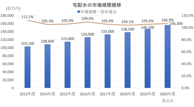 (注)末端金額(エンドユーザー販売金額)ベース、2020年度は見込値、本調査における宅配水とは、ウォーターサーバーとセットで供給されるミネラルウォーターで、家庭や事業者などに宅配されるものを対象とする。