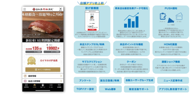 PUSH通知やお客様への来店ポイントやランク制度によるロイヤリティプログラム機能の充実は当然、お客様から得られた再来店データ/アンケート情報を元に、店舗改善・CS/ES両面の最大化を実現するためのツールとしてご活用頂ける様、日々サービスの提供及びアップデートを行っております。