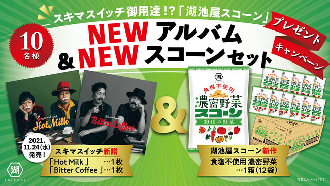 「スコーン 食塩不使用 濃密野菜-10種の野菜-」の発売を機に、「湖池屋スコーン」好きとしても有名なスキマスイッチさんと夢のコラボが実現しました。当商品の発売と同月の11月に、最新アルバム2枚を同時発売されるという縁もあり、今回はスキマスイッチさんのNEWアルバム2枚とNEWスコーンをセットにしてプレゼントするキャンペーンを実施します。スキマスイッチさんの最新アルバムを聴きながら、食塩不使用でカリッとサクッと楽しめる最新スコーンをぜひお楽しみください。