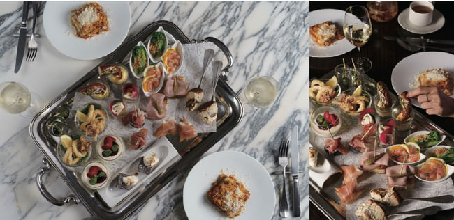 大きなプレートにずらりと並ぶメニューには、24ヶ月塾成のパルマ産生ハムを使った口どけのよい”生ハムメロン”や、セモリナ粉を使用しサクサクに揚げた“カラマリフリット”の他、本国でも多くの方に愛される“ボッタルガプレッツェル”などの人気メニューを一口サイズでご用意しました。さらにシグネチャーの一つであるほうれん草を練りこんだ自家製パスタの“ラザニア”は贅沢に別皿にて提供いたします。