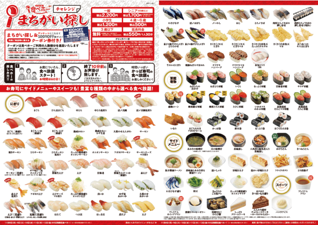 11月の「食べホー」は、前回の「なぞなぞ食べホー」に続き、かっぱ寿司の“うまい!”お寿司をたくさん食べていただくのはもちろん、お食事の間もワクワクお楽しみいただける「まちがい探し 食べホー」を実施いたします!食べ放題をお腹いっぱいお楽しみいただいた後、レジスタッフに回答用紙をお渡しいただくと、回答の正誤に関わらず、次回ご来店時よりご利用いただける税込100円OFF券をご利用の人数様分進呈いたします。