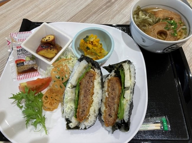 紹介:「石川県産コシヒカリ」に、「加賀レンコン」、「能登牛のメンチカツ」、が入った爆弾級な大きさの「おにぎらず」に「加賀車麩」を盛り込んだ、「小松うどん」がセットのボリュームたっぷりプレートです。