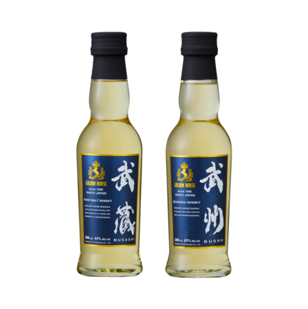 貯蔵年数の異なる複数のスコットランド産モルトをブレンドした、ピュアモルトウイスキーのゴールデンホース武蔵(1,870円(税込))。3年以上熟成されたスコットランド産ブレンドウイスキーをベースにスコットランド産モルトを併せた、ブレンデッドウイスキーのゴールデンホース武州(1,430円(税込))。これまでの700mlフルボトルに加え、200mlのミニボトルとして新発売しました。