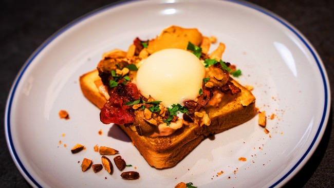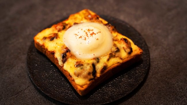 - 「The Burn」⽶澤⽂雄シェフ考案 ナイフとフォークで楽しむ『#禁断の雪見トースト』「ベーコンチキン雪見」