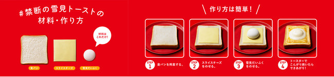 『#禁断の雪見トースト』は、巷で話題となっている「雪見だいふく」の新たな食べ方。公式紹介後、TV、SNSを中心に話題となっており、『#禁断の雪見トースト』を試してみる人が続出!「簡単なのにおいしい!」「やみつきになりそう!」「これはハマる人多いのがわかる!」と禁断のおいしさに、うっとりとろけてしまう声が多数寄せられ、「雪見だいふく」の新たな楽しみ方として、盛り上がっております。