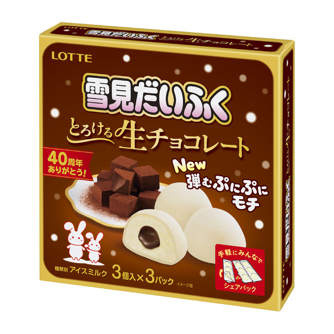 センターに入った生チョコレートのとろける味わいと、“弾むぷにぷにモチ”が楽しめるこの時期におすすめの雪見だいふくです。
