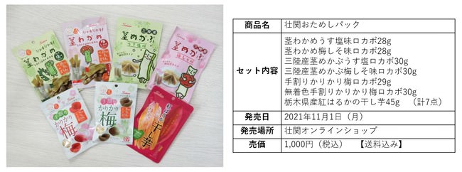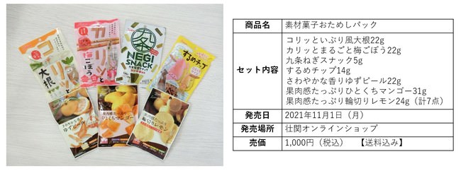 株式会社壮関(本社:栃木県矢板市 代表取締役社長:板山 健一)は、素材菓子お試し買いパック『壮関おためしパック』『素材菓子おためしパック』『れんこんチップ味くらべパック』を2021年11月1日(月)より壮関オンラインショップ(https://sokan.shop/)にて発売いたしました。