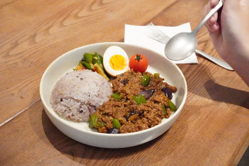 4種のスパイスを使った季節野菜のドライカレー。10月・11月は茄子の素揚げを入れました。付け合わせはたたききゅうりと酢じょうゆ卵。栗原さんおすすめの十穀米ともよく合う、野菜がたっぷり入ったおいしいドライカレーです。
