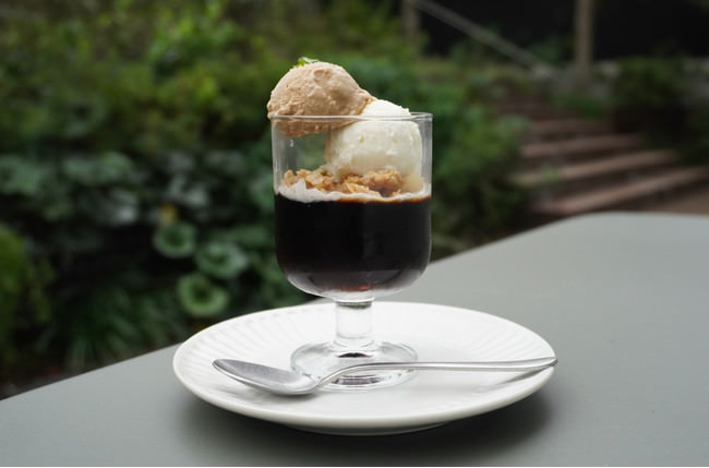 ライブラリーブレンドを使用したコーヒーゼリーの上には、forucafeさんのオリジナルシナモングラノーラ、バニラアイス、そしてコーヒーアイスが乗っております。