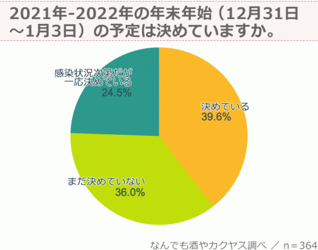 では、2021年-2022年の年末年始(12月31日~1月3日)はどうなのでしょうか。調査を行った10月中旬時点で、年末年始の予定を「決めている」と回答した人は全体の40%、「感染状況次第だが、一応決めている」は24%で、これらを合わせると6割以上の人が年末年始のプランをすでに検討していたことがわかりました。