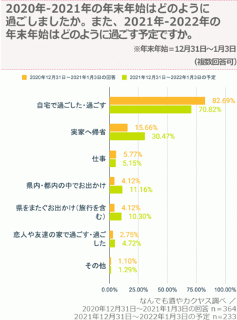 確かに、昨年12月25日には菅義偉前首相が新型コロナウイルスの感染拡大が過去最悪の水準となっていることを受けて記者会見を行い、会食を控えるなど“静かな年末年始”を送るように国民に要請。都道府県知事らも年末年始の帰省を自粛してほしいとのメッセージを発表しました。こうした国をあげての呼びかけを受け、自宅での年越しを選んだ人が多かったことが、アンケート結果にもうかがえます。