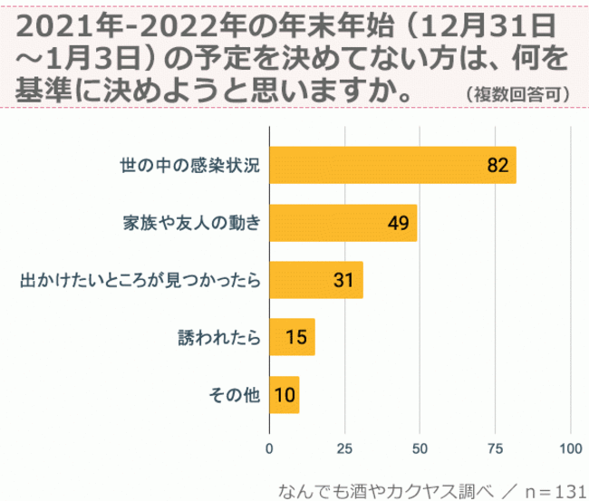 一方、「まだ決めていない」と回答した人は全体の36%と一定数いますが、そうした人たちを対象に、何を基準に決めようと思っているかを問うたところ、最も多かったのが「世の中の感染状況」でした。次いで「家族や友人の動き」、「出かけたいところが見つかったら」と続きます。