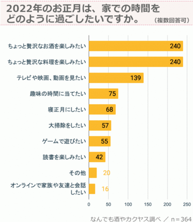 2021年同様、2022年も多くの人が自宅でお正月を過ごそうと考えていますが、どのように過ごしたいのかを複数回答可で聞いてみたところ、圧倒的に多かったのが「ちょっと贅沢なお酒を楽しみたい」と「ちょっと贅沢な料理を楽しみたい」でした。