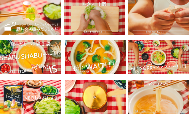 また、「ヘルシーなのに食べごたえたっぷり!豚レタス極みだししゃぶ」篇では、格闘技のリングコールでもお馴染みのレニー ハートさん演じる母が見守る中、「マッチョな3兄弟」が包丁を使わずに豪快に作るしゃぶしゃぶの光景を表現しました。ぶりと長いもの意外な食材との組み合わせや、洋の野菜を和の極みだしでいただくアレンジなど、〆まで楽しめる鍋を囲んだドラマ仕立ての家族模様を描いた、思わずしゃぶしゃぶしたくなる動画をお楽しみください。