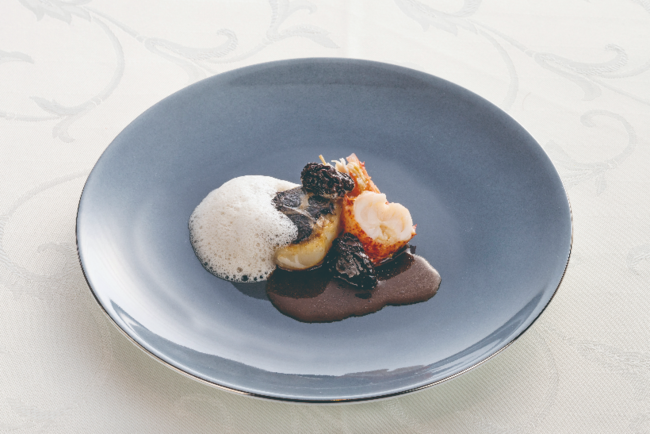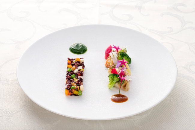 前菜1:ラングスティーヌとアワビのソテー冬野菜と黒米のサラダ添え