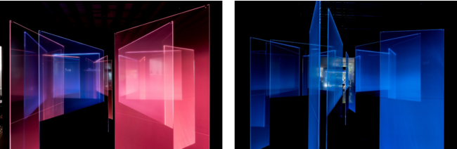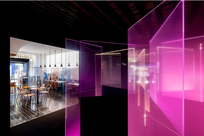 1Fガレージの展示スペースでは、「RAYCREA」のフィルムを貼りつけた12枚の透明のアクリル板が結晶のように立ち並び、変形した六角形*を形成するように設置されています。アクリル板の端部にはLED光源が設置されており、点灯するとフィルムを貼りつけた部分が面として光と色を纏います。見る位置により色が幾重にも折り重なって見え、見る角度により光の透過性も変化するため、多様な光と色の重なりにより、展示全体を通して光の様々な表情を見ることができる展示となっています。さらに音楽にあわせてLEDが点灯することにより光がまるでゆらいでいるかのように見え、幻想的な空間を作りだします。
