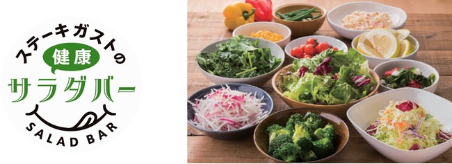 ステーキガストの全ての鉄板メニューに+400円(税込440円)でサラダ・カレー・スープ・デザート・パン等約20種が食べ放題の健康サラダバーをつけることができます。