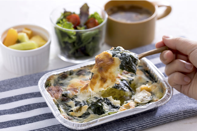 青森県の寒い土地で作られるほうれん草は甘味があり、くせがなく美味しいです。ほうれん草は栄養価が高いことは知られていますが、やはり美味しく食べてほしいと思います。ほうれん草を美味しく食べるために、ミルク感のあるクリーミーな味わいに仕上げました。ほうれん草の甘味を生かし、チーズの旨味、クリームの濃厚さで、お子様でも満足できる味わいにしました。ご飯入りのドリアなので、忙しい時の1食として、ぜひ活用してほしいです。昔懐かしいアルミトレーなので、トースターで焼いて楽しんでください。