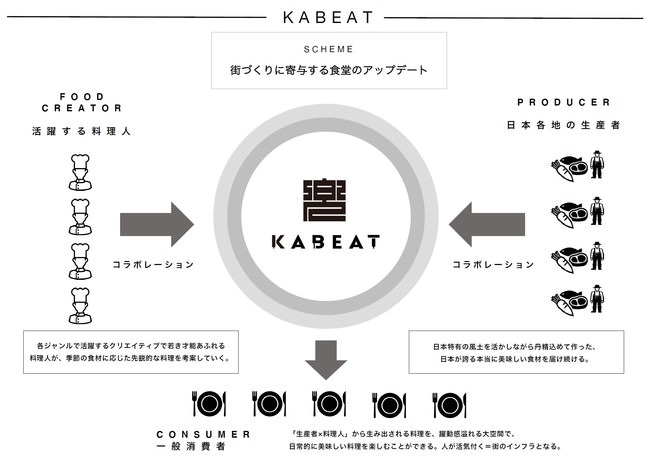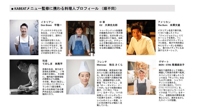 メニューは、「Don Bravo」平雅一氏、「O2」大津光太郎氏、「The Burn」 米澤文雄氏、「てのしま 」林亮平氏、「Morceau」秋元さくら氏、「BIEN – ETRE」馬場麻衣子氏の多ジャンルな人気若手料理人が監修。6名のシェフがKABEATという1つの場所で、食材の季節感を反映しながら次々とメニューを開発していくことは大きな挑戦であると考えています。