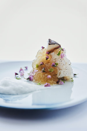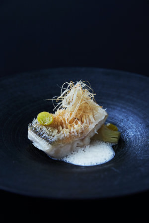 旨味のギュッと詰まった白甘鯛を皮目をパリパリに仕上げ、揚げネギの食感と香りを重ねました。出汁で炊いた愛媛県産蕪のソースに銀杏と実山椒の香りを添えました。