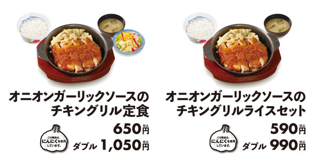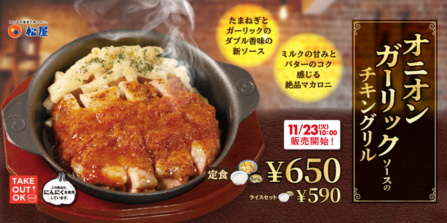 | 商品名 オニオンガーリックソースのチキングリル定食 650円 オニオンガーリックソースのチキングリルライスセット 590円 ※お持ち帰りいただけます。お持ち帰りにみそ汁は付きません。 お持ち帰りの場合、みそ汁は別途60円でお求めいただけます。 ※全て税込み価格です。また、店内・お持ち帰りの税込価格は同一です。 販売期間 2021年11月23日(火)午前10時~ |