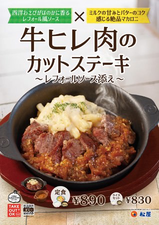 「牛ヒレ肉のカットステーキ」は、鉄板でジューシーに焼き上げた柔らかいヒレ肉に、西洋わさびがほのかに香る新作「レフォール風ソース」がかかった逸品。付け合わせは西日本地域の店舗で発売される「オニオンガーリックソースのチキングリル」と同じクリームマカロニ。松屋自慢の絶品マカロニは全国の松屋でお召し上がりいただけます。