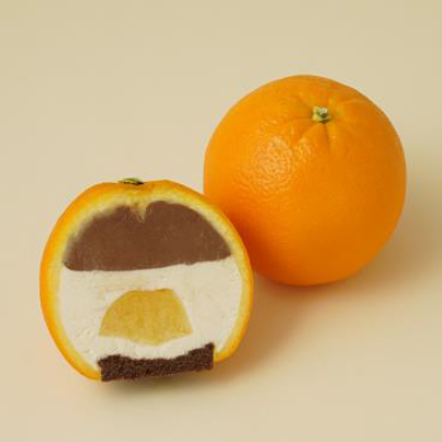 オレンジまるごと一個を使用したショコラオランジュです。濃厚なビターチョコムース、フロマージュムース、オレンジジュレ、チョコレートスポンジを詰め込みました。爽やかなオレンジの風味が広がる一品で、さっぱりとお召し上がりいただけます。