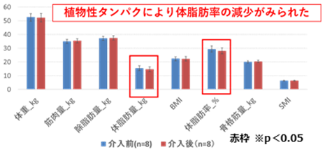 この結果から、植物性タンパク食品を1ヶ月間摂取すると、炭水化物の不足を補うためにエネルギー産生に優先的に使用されていたタンパク質を補えるため、筋肉量増加、体脂肪率の減少につながり、隠れ肥満を緩和することができたと考えられます。