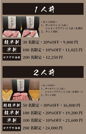 ・「幻の中の幻の佐賀牛」のサーロイン、シャトーブリアンをご提供!国産長期熟成穀物牛タンとセット!