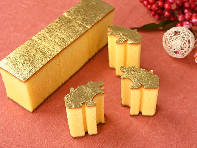 金沢の名産品を贅沢に一面に施してみたら・・・という、ひらめきから生まれたのが豪華絢爛の「金かすてら」です。職人が一本一本丁寧に焼き上げるしっとりとしたかすてらにはこだわりの美味しさが詰まっています。