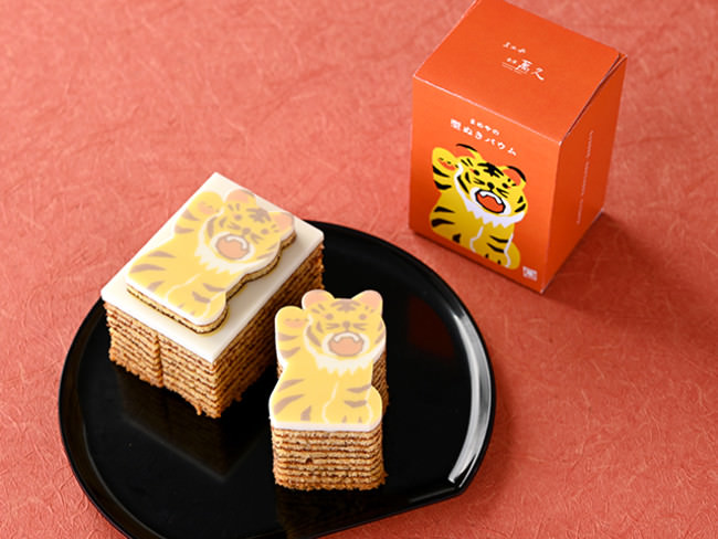 手のひらサイズのバウムクーヘンに、遊びごころの型抜きをお入れしたゆるかわいい干支の寅の型ぬきバウムです。